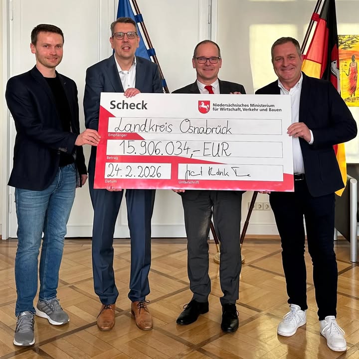 Rund 16 Mio. Euro vom Land für den Glasfaserausbau im Landkreis Osnabrück. 💻🤝🏻 Die Förderung fließt in diese Ausbaugebiete:📍 ,,Südwest" (mit 5,2 Mio. ? für Georgsmarienhütte, Hasbergen, Hagen a.T.W., Bad Iburg, Glandorf),📍 ,,Südost" (mit 10,7 Mio. ? für Bad Laer, Bad Rothenfelde, Dissen, Hilter und Melle).Gestern gab es den symbolischen Förderscheck für die ,,Grauen Flecken" in unserer Region, die noch mit Geschwindigkeiten zwischen 30 und 50 Mbit/s unterwegs sind und gigabitfähig werden sollen. Es ist eine Kofinanzierung: 50 % der Fördermittel kommen vom Bund, 25 % vom Land, 25 % vom Landkreis und unseren Kommunen. Gut, dass wir uns vor gut zwei Jahren mit vereinten Kräften eingesetzt haben, dass die Breitbandförderung weitergeht.Wir brauchen sie für Familien, Unternehmen, Telemedizin, Verwaltung, Landwirtschaft - kurz: für Lebens- und Arbeitsqualität in unserer Region. #Digitalisierung #Breitbandförderung#mitvereintenkräften #landkreisosnabrück #glasfaser